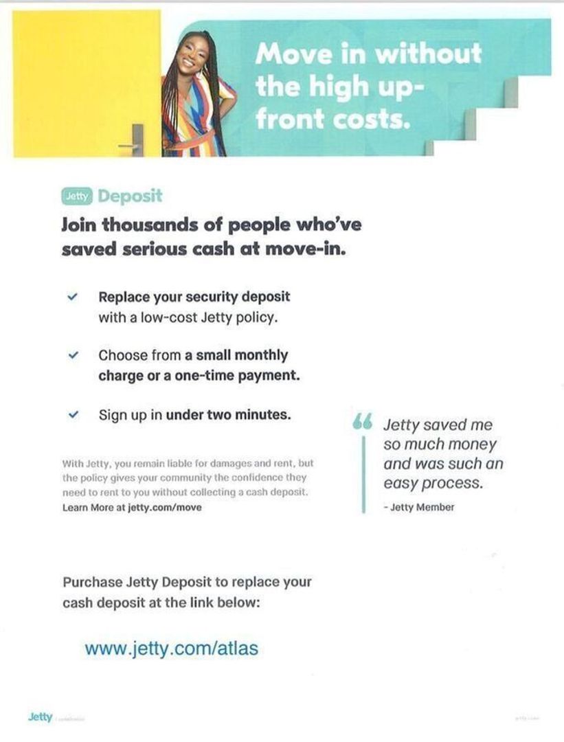 Deposit: Atlas Real Estate has partnered with Jetty to offer an affordable alternative to upfront cash security deposits. Residents approved through Jetty can choose between purchasing a deposit replacement policy with Jetty at a fraction of the upfront cost OR pay a security deposit as low as 1 month’s rent, for well qualified applicants.
