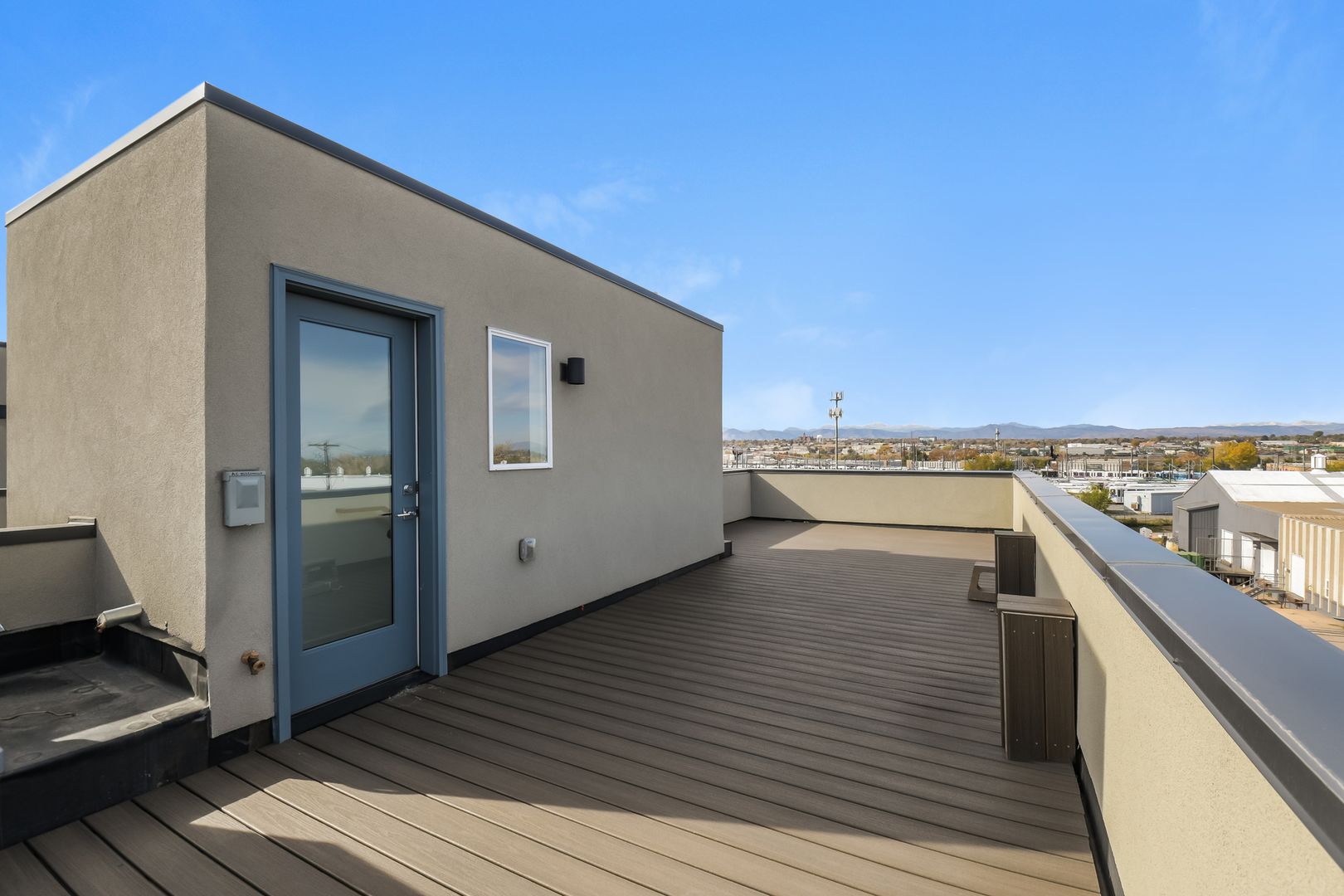 The fourth level opens to a spacious rooftop patio with panoramic mountain views, the Denver skyline, and an overlook of the light-rail yard.