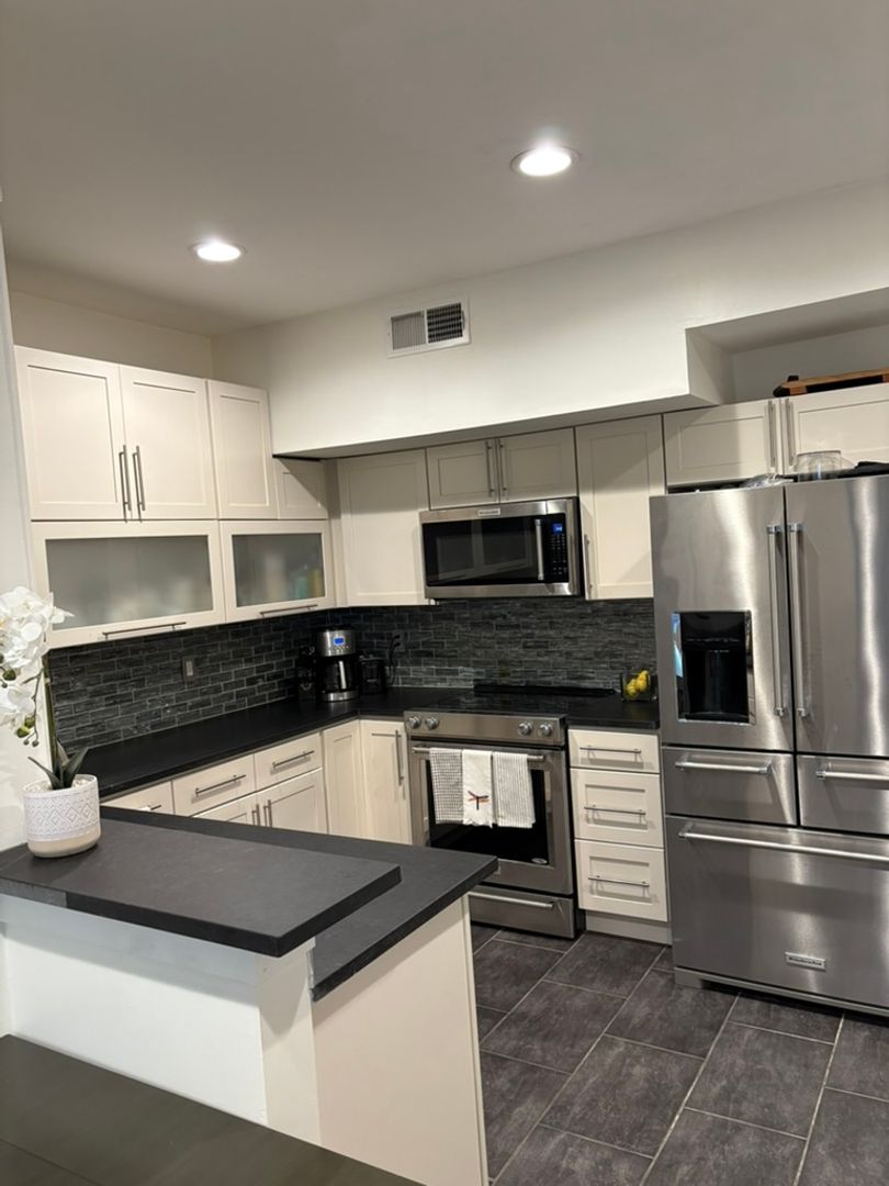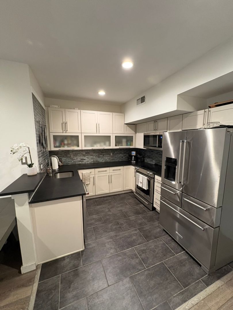 The newly remodeled kitchen features stainless steel KitchenAid appliances, including a standout refrigerator, along with granite countertops, white cabinetry, and a custom tile backsplash that adds a polished touch.
