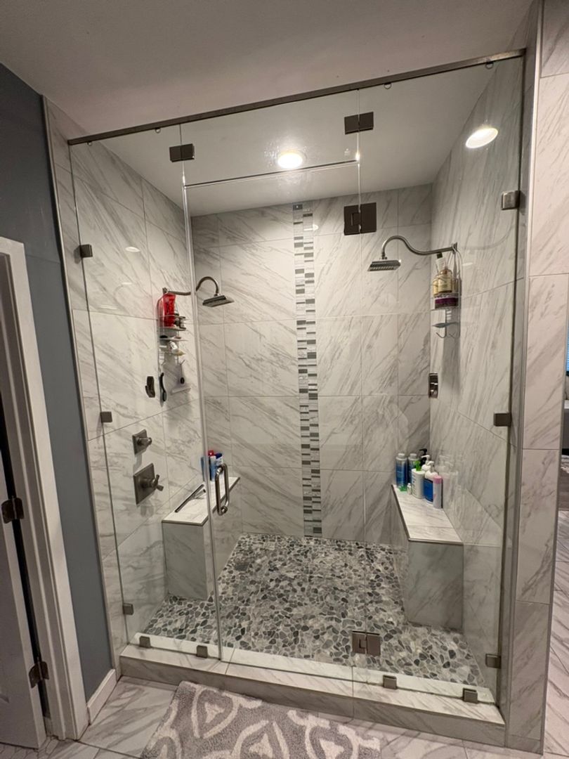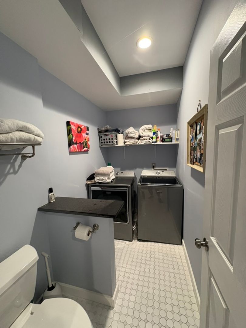 The primary bedroom offers high ceilings, a charming window seat, and a stylish, highly functional custom closet system. The attached bathroom showcases beautiful finishes and a spacious walk-in double shower. Conveniently, the washer and dryer are located just off the primary bathroom for easy access.