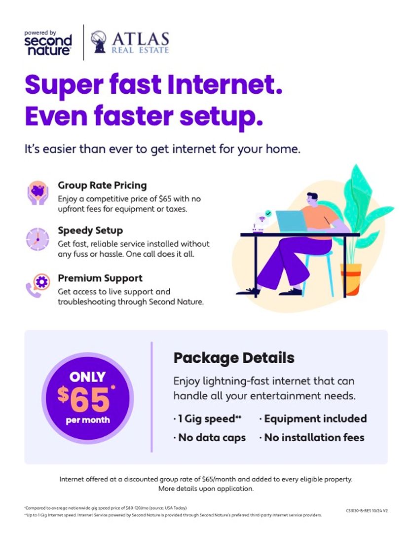 **This unit comes with high-speed internet up to 1 Gig at just $65/month, with premium support and setup powered by Second Nature to get you connected fast at move-in. Our Internet Service delivers download speeds of up to 1 Gbps (1,000 Mbps) and includes certain equipment, giving residents a robust, reliable connection that enhances productivity, entertainment, and connectivity for both personal and professional use. If the property is eligible, then by applying, the Applicant agrees to be enrolled in the Internet Service and to pay the applicable cost of up to $65/month, payable with rent. Internet Service shall be provided by a third-party Internet Service Provider selected by Atlas Real Estate. Additional terms may apply.**
