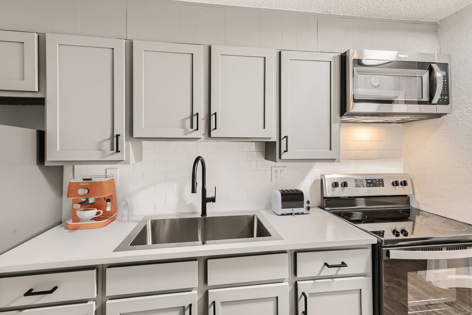 - Newly installed cabinets with quartz counters and a farmhouse sink