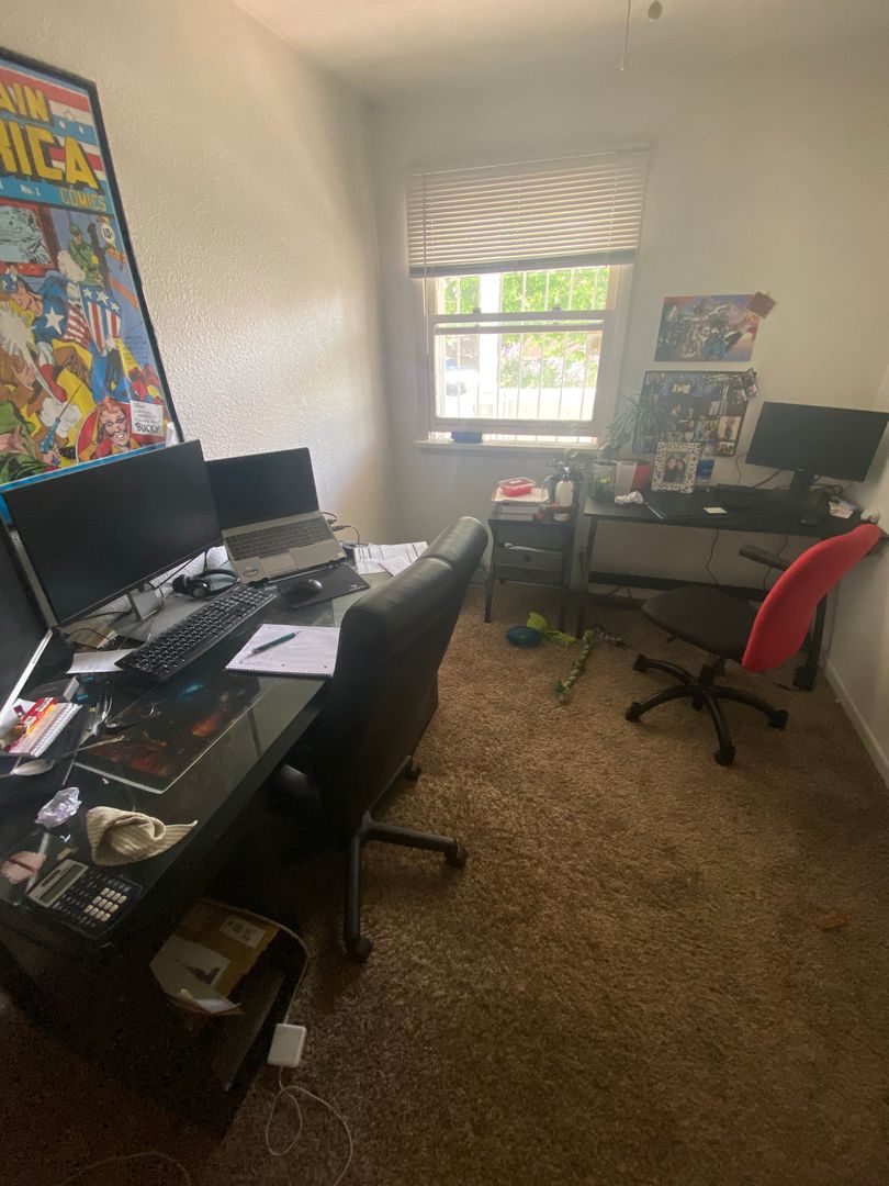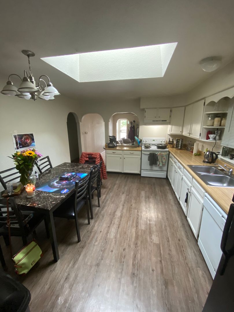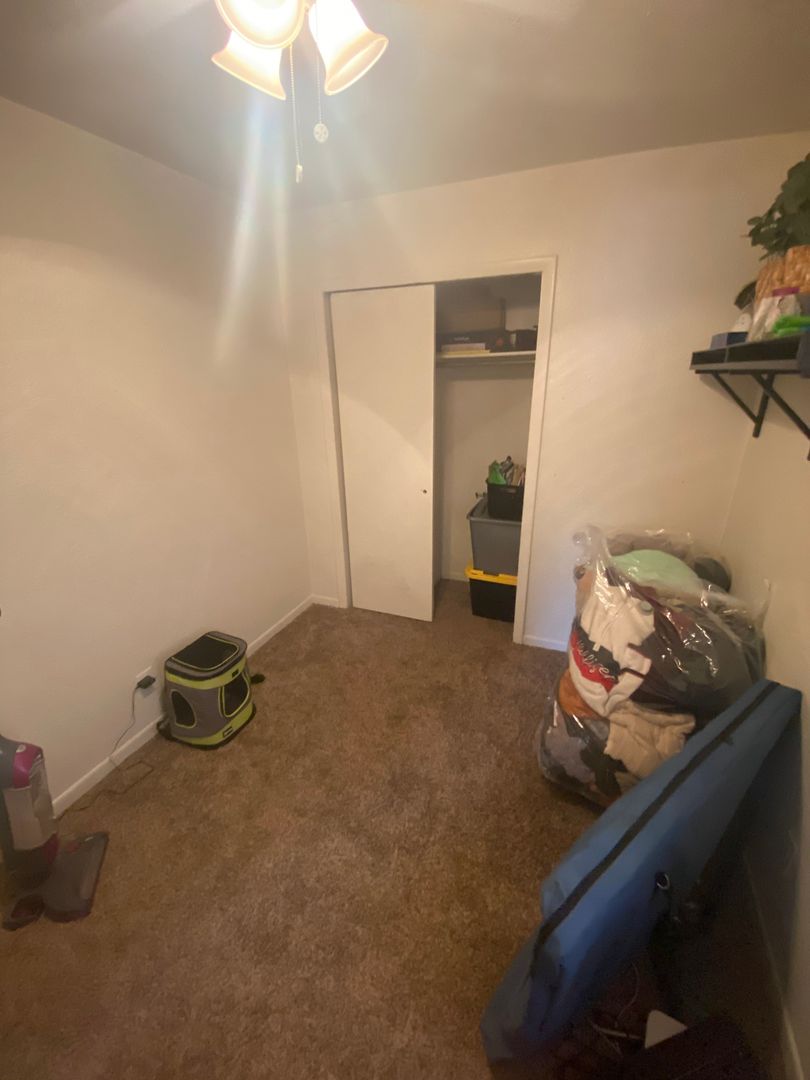 Large eat-in kitchen with lots of cabinet space and gas range. Comes with a Washer/Dryer. There are Two bedrooms up front with a full bath (tub). In the back of the house there is a larger bedroom with another full bathroom! Enjoy the Large carpeted living room and the backyard with a 6' privacy fence, which is great for pets, kids, and BBQ!