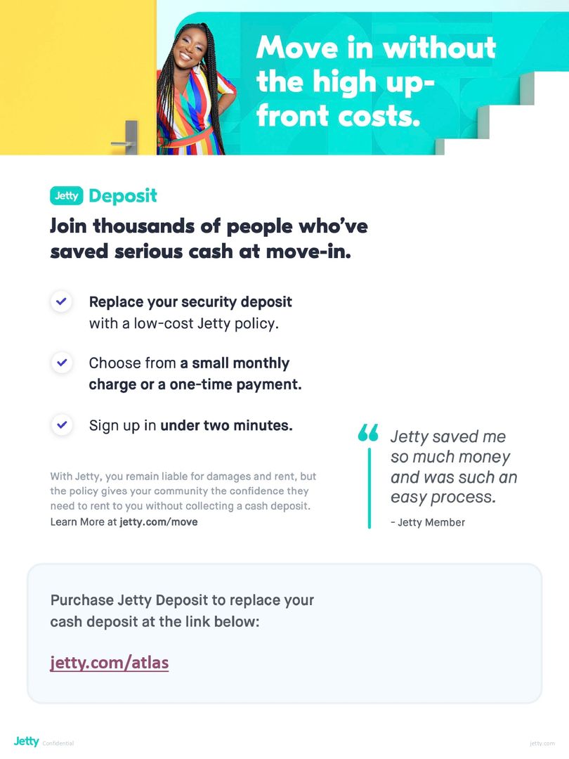 Atlas Real Estate has partnered with Jetty to offer an affordable alternative to upfront cash security deposits. Approved residents can choose between paying a security deposit equal to one (1) month’s rent (On approved Credit) OR purchase a deposit replacement policy with Jetty at a fraction of the upfront cost.