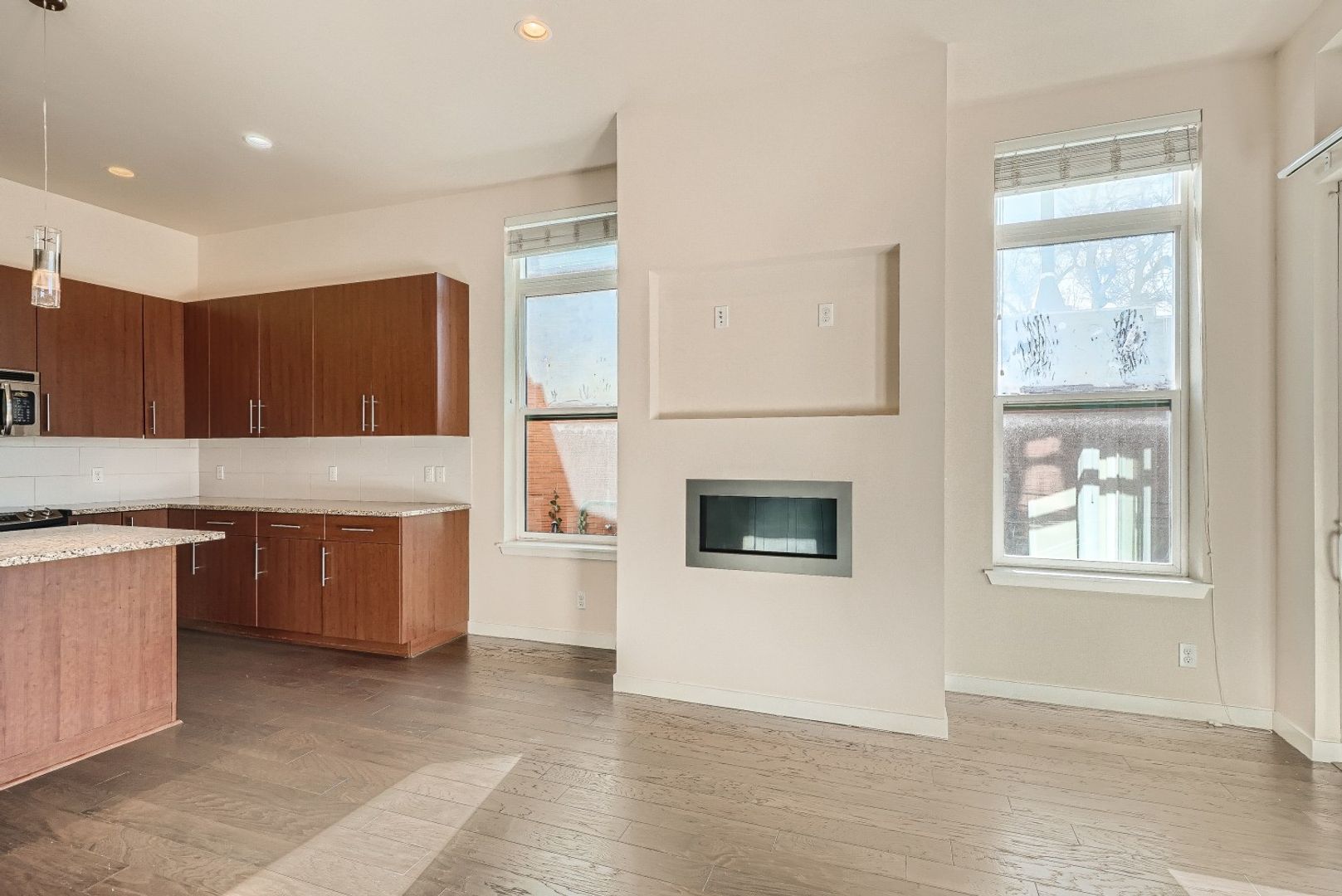 The kitchen is thoughtfully designed with granite countertops, a tile backsplash, and generous cabinet space. A washer and dryer are included for added convenience.