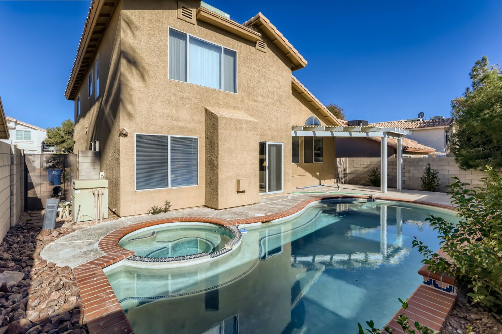 Gorgeous 2 story home in the Northwest located near Sun City Summerlin. This home features 3 bedrooms and 3 baths, vaulted ceilings throughout, tile floors down and carpets upstairs. Fully renovated kitchen/dinning room combo. This kitchen features a centered island, custom cabinet handles, new ceramic tile flooring, extra thick quartz counter tops, and brand new appliances. Beautiful backyard with pool and jacuzzi - just in tie for summer! It's a MUST SEE!