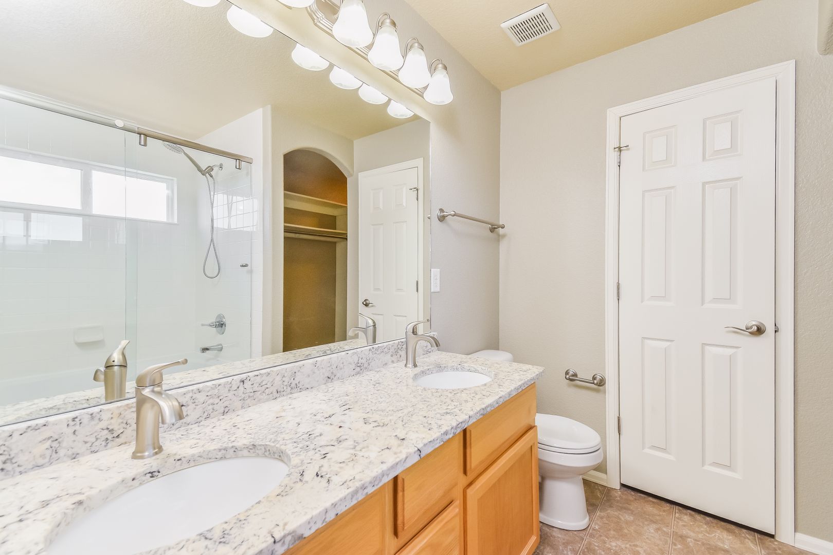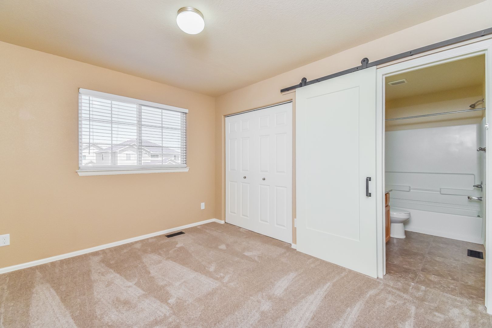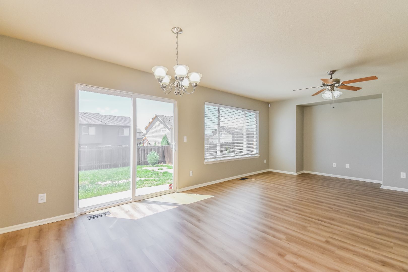 This stunning two-level home is located in El Paso County. The property boasts a spacious living room that provides a lovely view of the fenced backyard, allowing for a seamless indoor-outdoor connection. The kitchen is equipped with modern stainless amenities, giving it a sleek and contemporary feel. Additionally, there are ample cabinets in the kitchen, providing plenty of storage space for all your culinary needs. The main bedroom in this home has a beautifully designed bathroom, complete with double sinks.