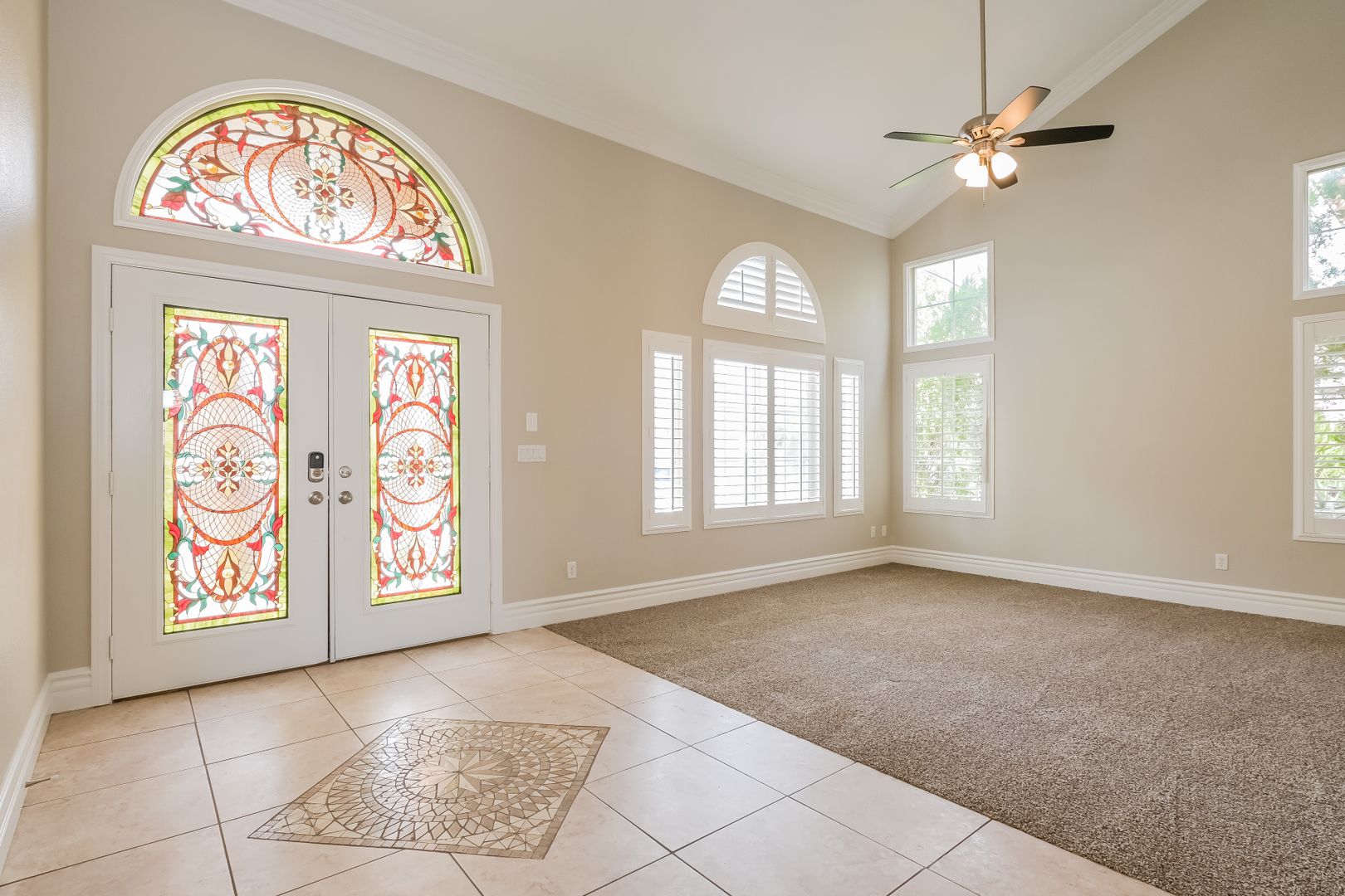 This spacious property offers both a large living room and a comfortable family room—perfect for entertaining or relaxing with loved ones. Features include elegant wooden shutters, ceiling fans throughout, a stunning custom stained-glass front door, and soaring vaulted ceilings. The living room boasts a convenient wet bar, while the upstairs primary suite offers a luxurious garden tub for ultimate relaxation. Don’t miss out—this home has it all!