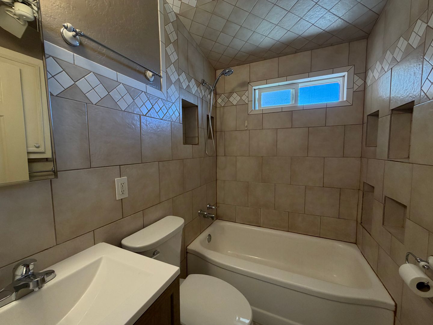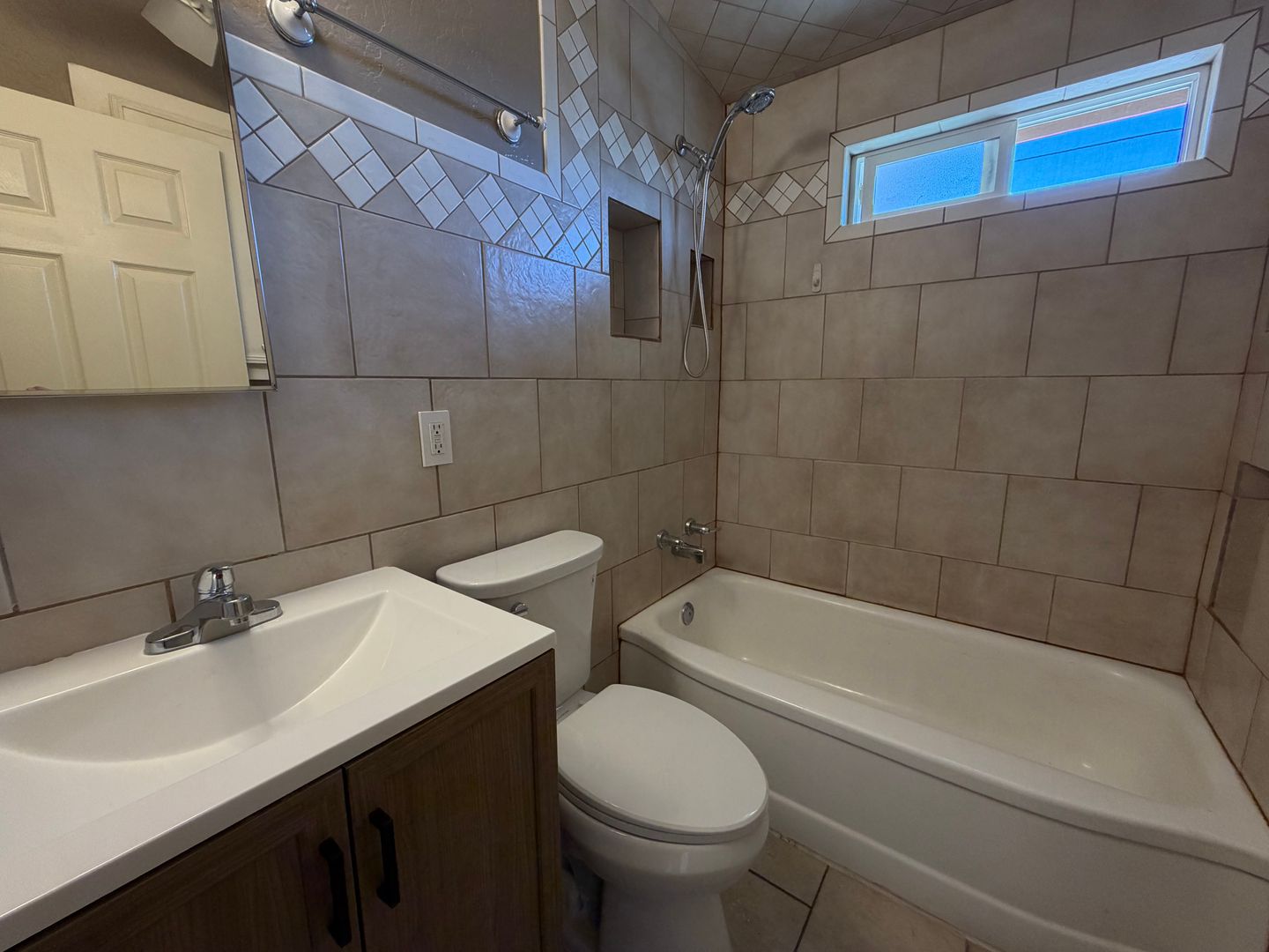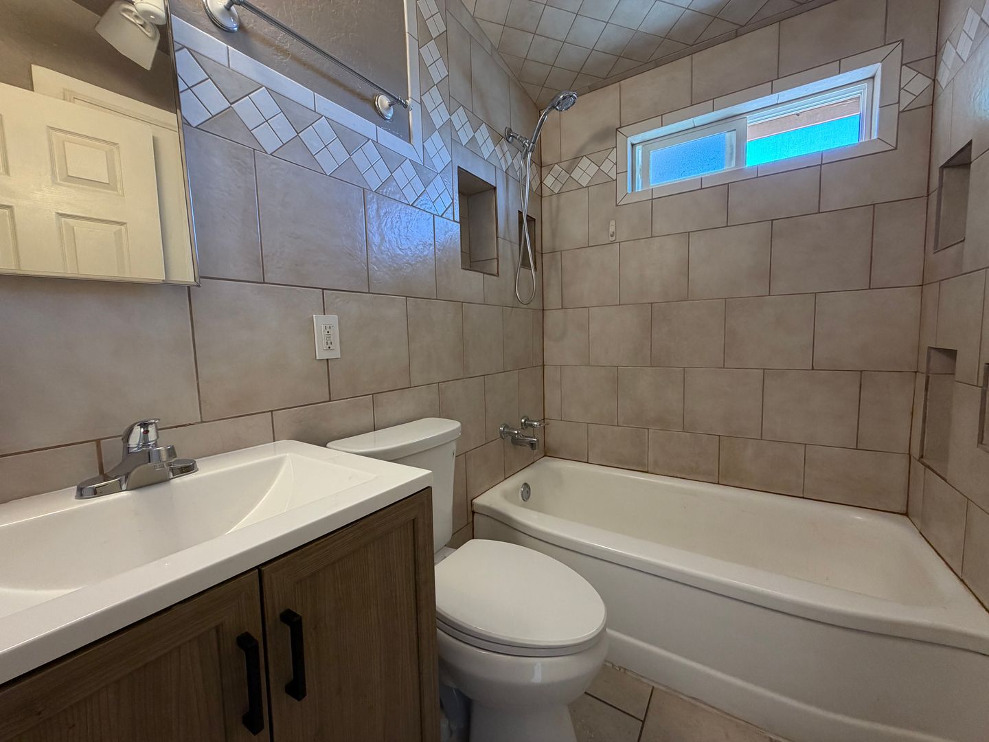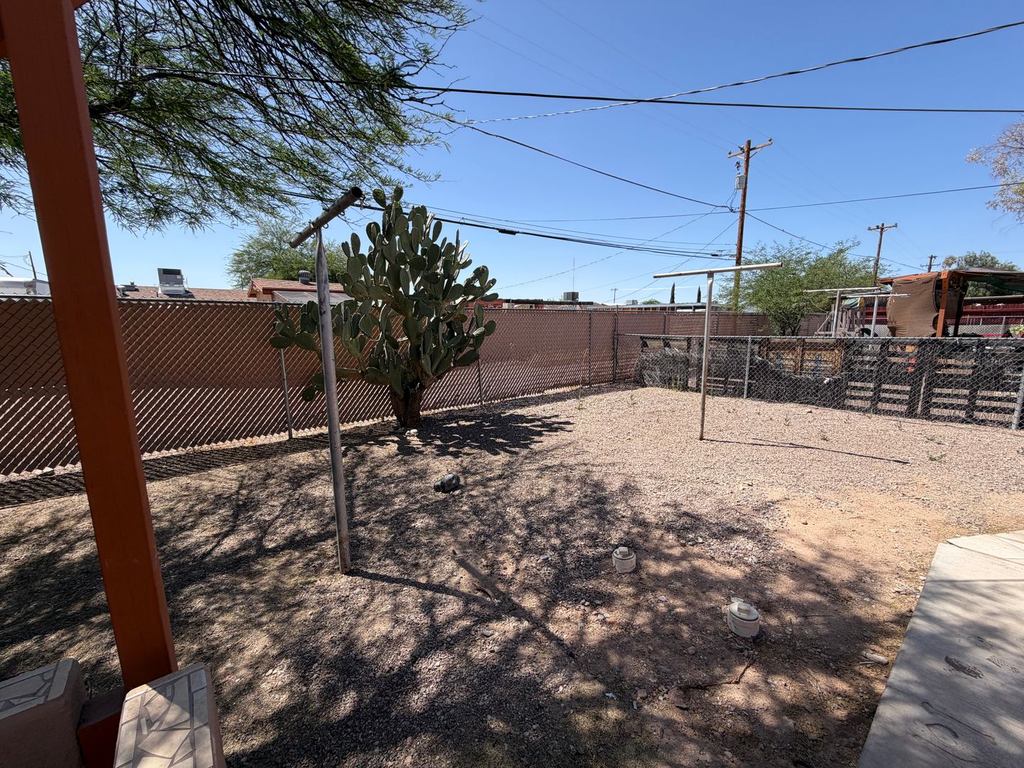 Updated 2-bedroom, 1-bath house in Tucson featuring central air and tile flooring throughout for easy upkeep. The home includes a dedicated laundry room in the backyard with Gas & Electric dryer hookups. ceiling fans throughout, built-in shelving and a defined dining area. Step outside to your large, fenced, private backyard that provides outdoor space for relaxation or gardening. Conveniently located and move-in ready, this property offers practical updates in a comfortable layout.